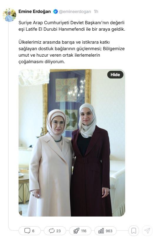 Emine Erdoğan, NSosyal hesabından yaptığı açıklamada, Suriye Cumhurbaşkanı Şara’nın eşi Latife El Durubi’yle bir araya geldiğini belirterek, “Ülkelerimiz arasında barışa ve istikrara katkı sunan dostluk bağlarının güçlenmesini; bölgemize umut ve huzur getiren ortak adımların çoğalmasını diliyorum.” ifadesini kullandı.