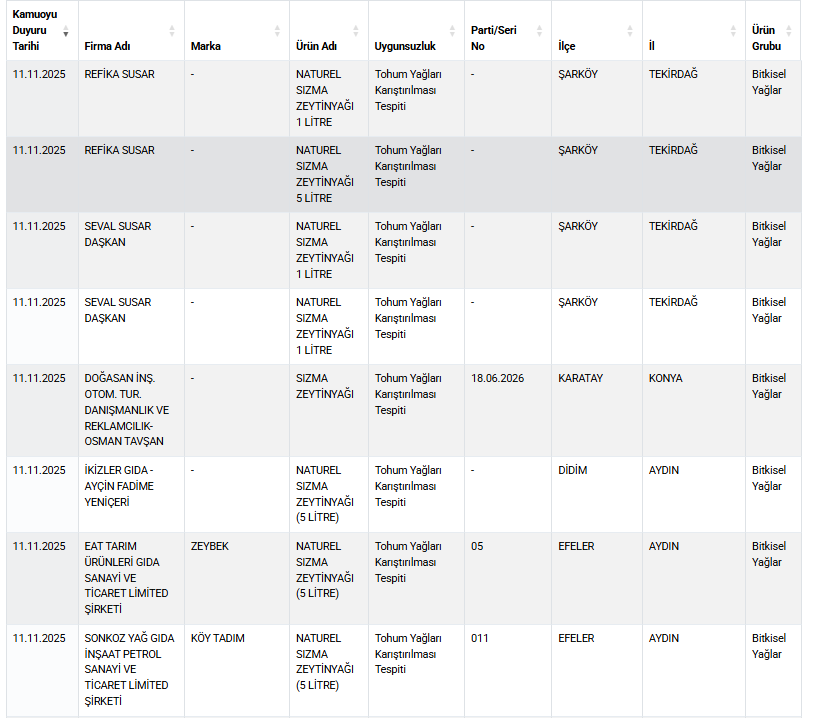 Ticaret Bakanlığı, 11 Kasım 2025 tarihli denetim sonuçlarını kamuoyuna duyurdu. Denetimlerde özellikle bitkisel yağlar ve et ürünleri grubunda ciddi uygunsuzluklar tespit edildi.