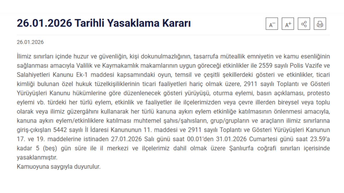 “İlimiz sınırları içinde huzur ve güvenliğin, kişi dokunulmazlığının, tasarrufa müteallik emniyetin ve kamu esenliğinin sağlanması amacıyla Valilik ve Kaymakamlık makamlarının uygun göreceği etkinlikler ile 2559 sayılı Polis Vazife ve Salahiyetleri Kanunu Ek-1 maddesi kapsamındaki oyun, temsil ve çeşitli şekillerdeki gösteri ve etkinlikler, ticari kimliği bulunan özel hukuk tüzelkişiliklerinin ticari faaliyetleri hariç olmak üzere, 2911 sayılı Toplantı ve Gösteri Yürüyüşleri Kanunu hükümlerine göre düzenlenecek gösteri yürüyüşü, oturma eylemi, basın açıklaması, protesto eylemi vb. türdeki her türlü eylem, etkinlik ve faaliyetler ile ilçelerimizden veya çevre illerden bireysel veya toplu olarak veya ilimiz güzergâhını kullanarak her türlü kanuna aykırı eylem etkinliğe katılmasının önlenmesi amacıyla, kanuna aykırı eylem/etkinliklere katılması muhtemel şahıs/şahısların, grup/grupların ve araçların ilimiz sınırlarına giriş-çıkışları 5442 sayılı İl İdaresi Kanununun 11. maddesi ve 2911 sayılı Toplantı ve Gösteri Yürüyüşleri Kanunun 17. ve 19. maddelerine istinaden 27.01.2026 Salı günü saat 00.01’den 31.01.2026 Cumartesi günü saat 23.59’a kadar 5 (beş) gün süre ile il merkezi ve ilçelerimiz dahil olmak üzere Şanlıurfa coğrafi sınırları içerisinde yasaklanmıştır.”